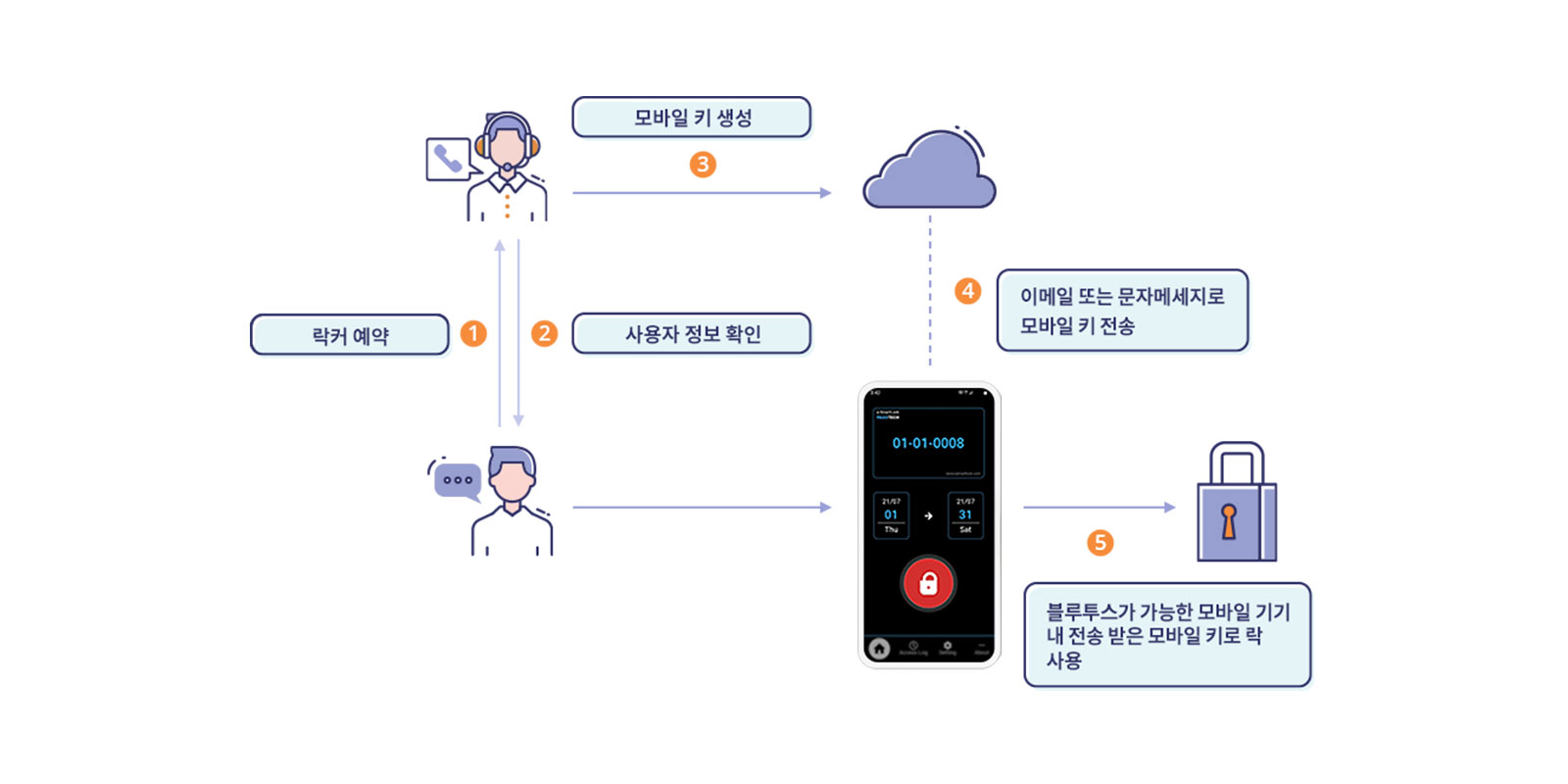 독특한 사용자 경험 클라우드 서버에서 받은 모바일 키를 사용하여 스마트폰으로 락에 액세스 | 고객 충성도 향상 고유한 사용자 경험을 통해 고객 확보 및 매출 증대 |
